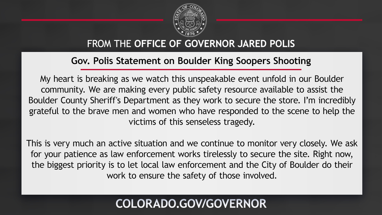 Governor Jared Polis On Twitter My Heart Is Breaking As We Watch This Unspeakable Event Unfold In Our Boulder Community We Are Making Every Public Safety Resource Available To Assist The Boulder