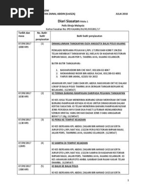 Seorang lagi saksi polis Inspektor Ali Asrar juga enggan bekerjasama dengan panel bila mereka minta diari kejadian yang berlaku pada 13 Februari. 32 rows 20080623 Polis 51 B- Pindaan 266 Diari Siasatan POLIS DIRAJA MALAYSIA BANTING REPOT. Hilang msikal di no 151-a kampung lapan tengkeramelaka.
